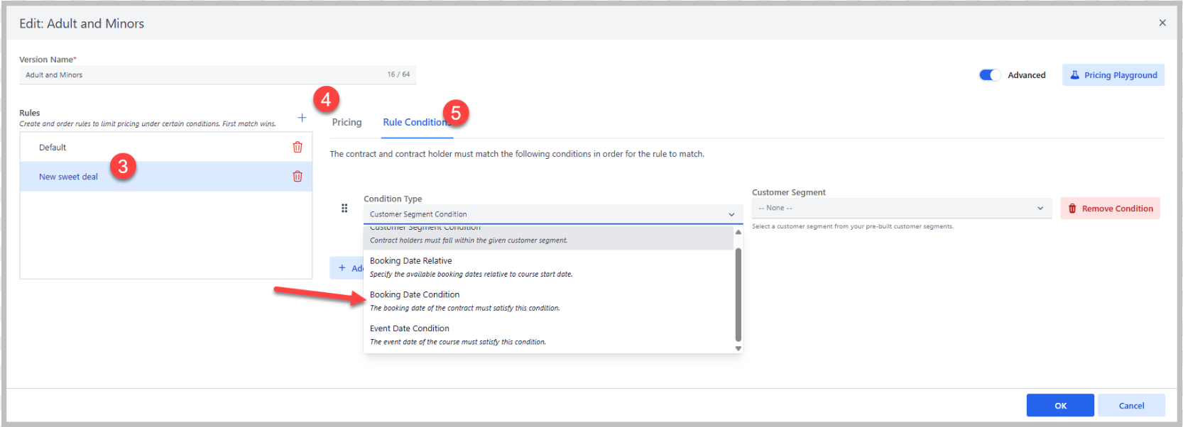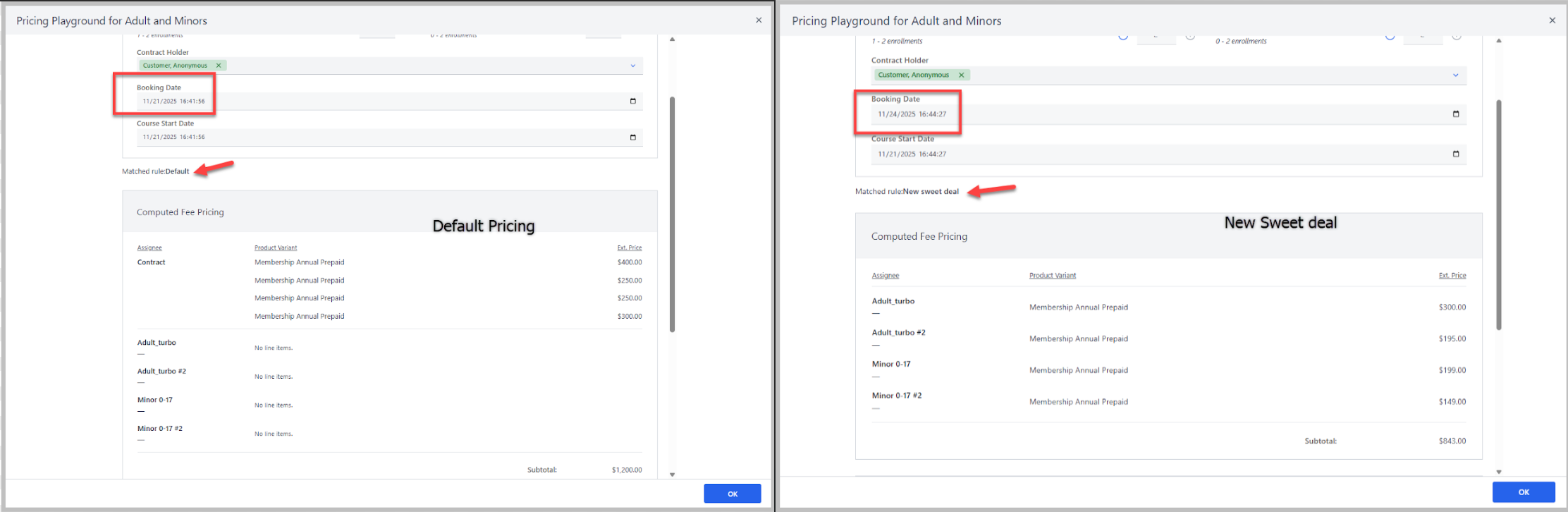 The pricing playground allows you to add customers to actually test any pricing rules related to segments, and let's you adjust hypothetical booking date and event date to test date restricted rules
