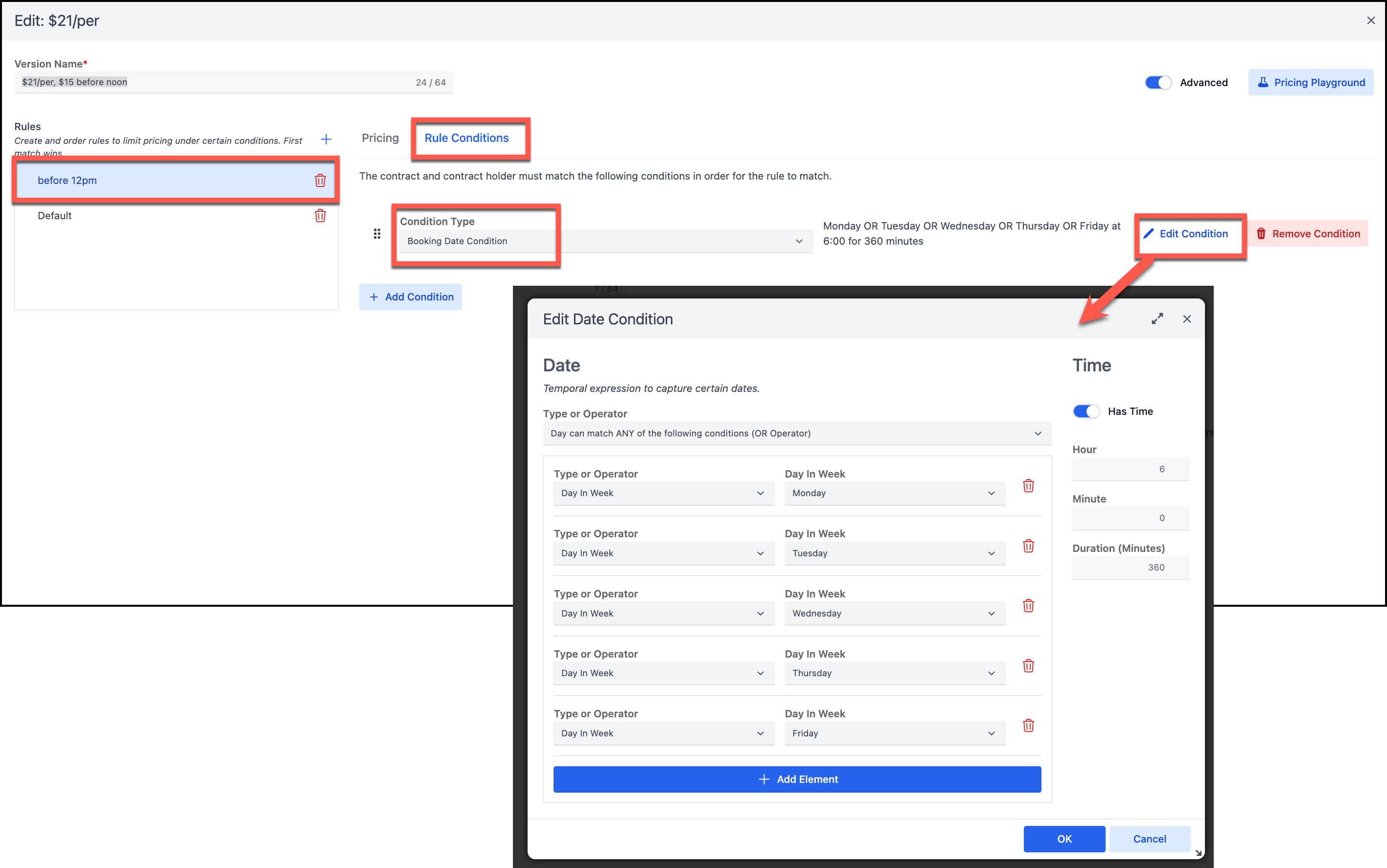 Pricing rules allow you to set up pricing that is dependent on the Booking date/time, the contract starting date/time, and Customer Segment conditions. This allows you to set up "early bird" pricing, certain sale pricing,