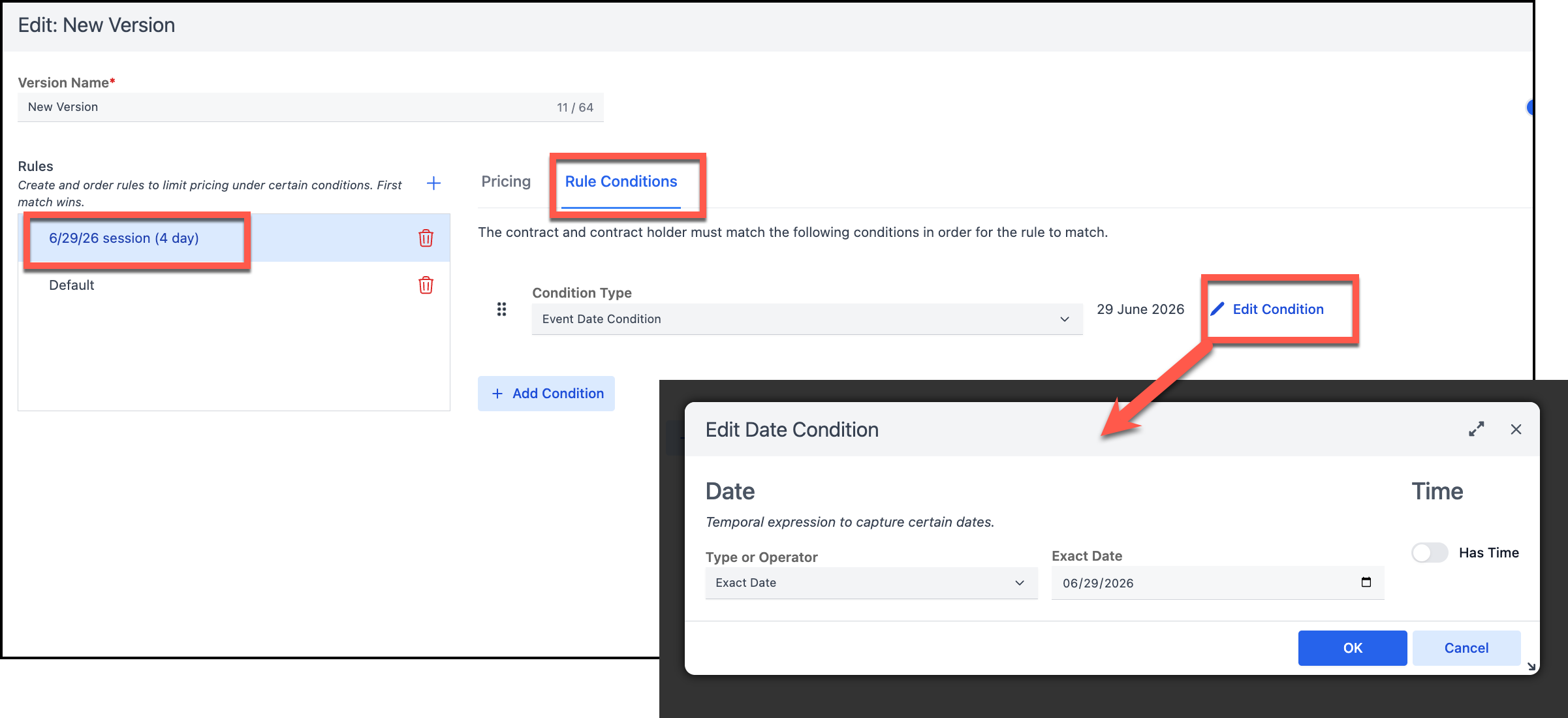 - Edit Condition: select Exact Date and set the date to the 1st session of that week to be discounted. That is the Event Start Date