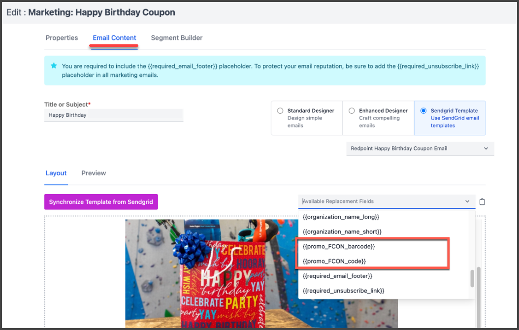 Promotion code replacement fields are now available in the enhanced email builder—making it easy to personalize campaigns and automate outreach with unique, trackable codes.