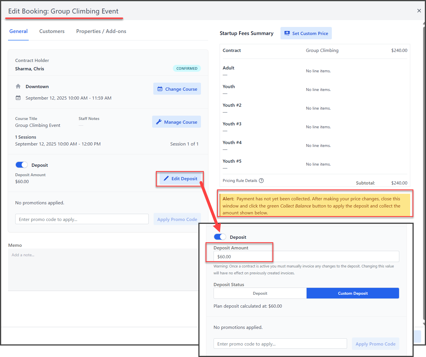 Pricing for the deposit can be edited directly from the booking: