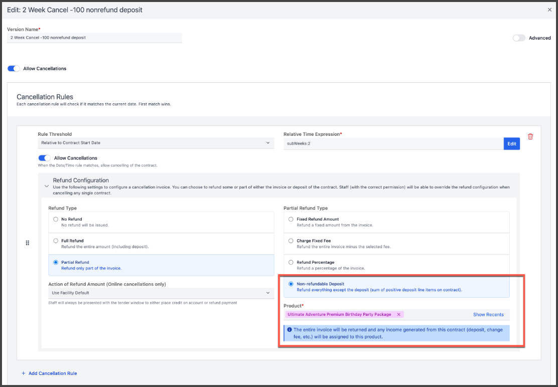 Cancellation/Deposit Refund terms can be defined from Plan configuration settings when configuring Partial Refunds on authorized cancellations: