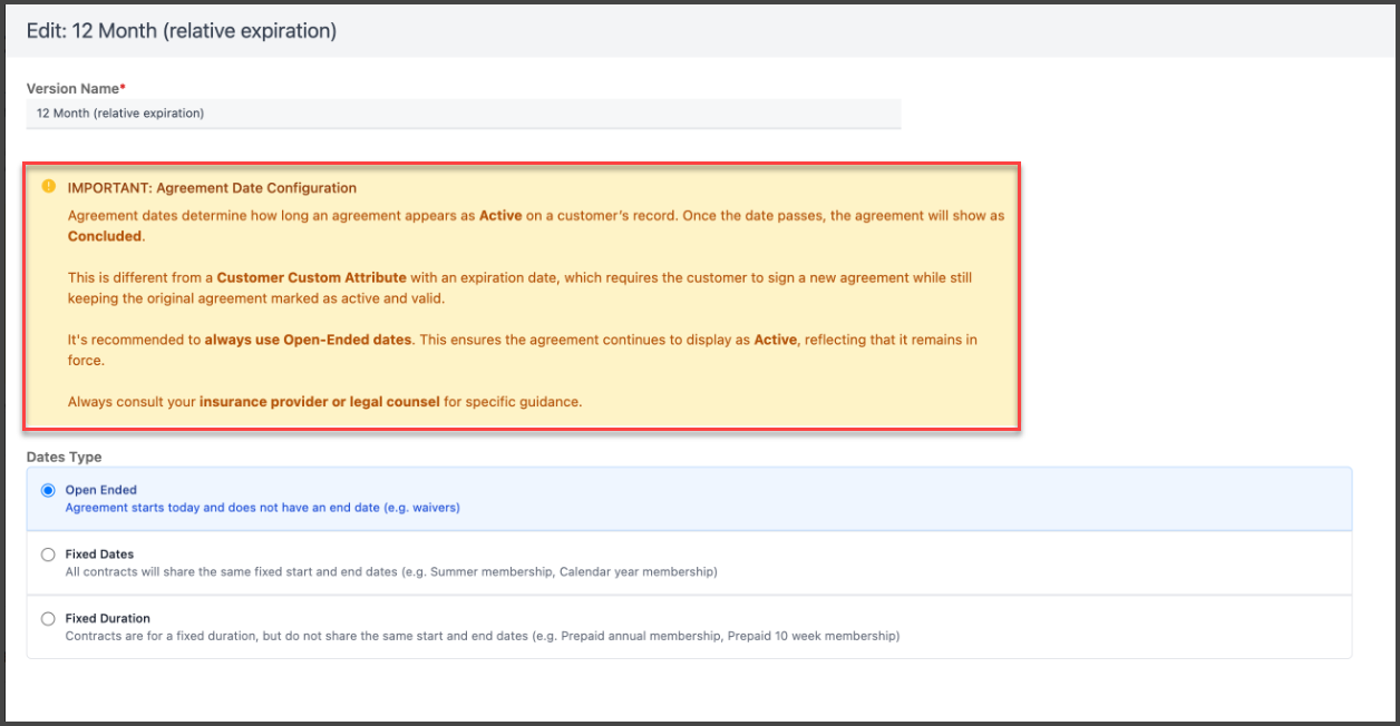 Plans: Added a warning regarding agreement end dates to plan dates configuration settings.