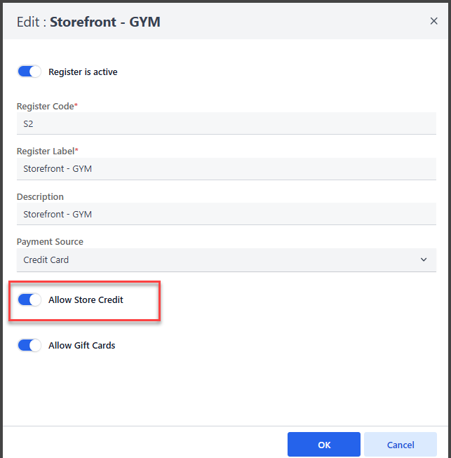 In Manage (Menu) > Organization & Facility Settings > Facility (Dropdown) > Point of Sale (Dropdown) > Registers > 'Edit' Storefront Register > Allow Store Credit (Toggle)