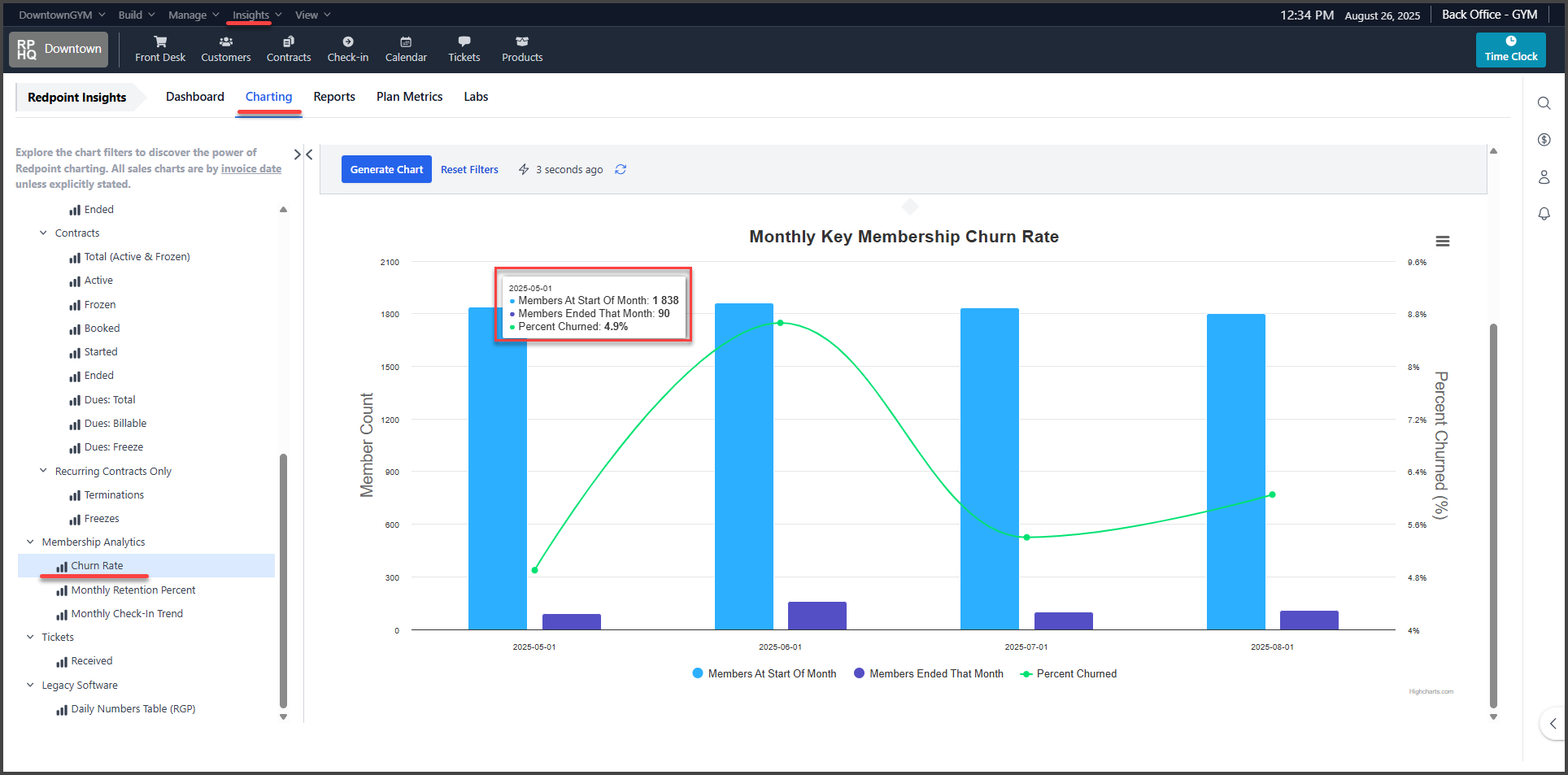 New (and exciting!) Membership Data Visualization Charts have been added to track Key Membership Plan performance across several key metrics. A new category of charting for Membership Analytics has been added to include the new charts for Membership Churn, Retention, and Check-ins.