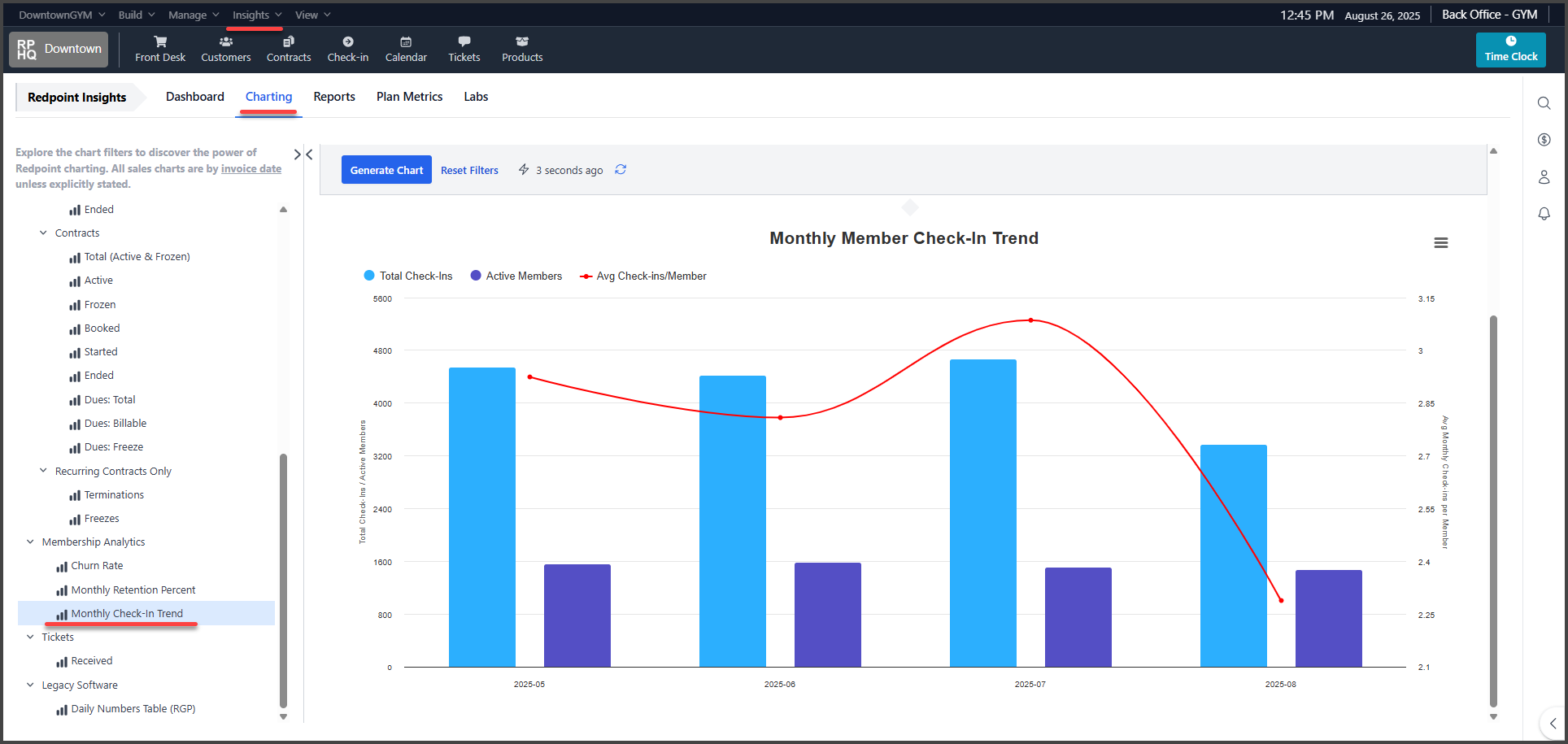 In Insights (Menu) > Charting > Charts (Tab) > Membership Analytics (Dropdown) > Monthly Check In Trend (Chart)