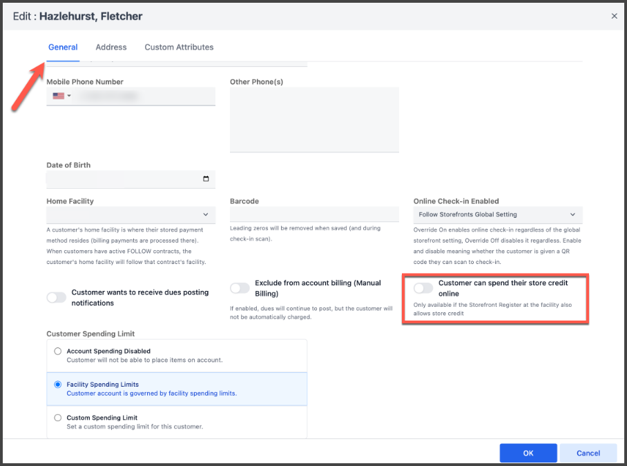 A toggle has also been added directly on the General tab of a customer record, to individually manage who is able to redeem store credit: