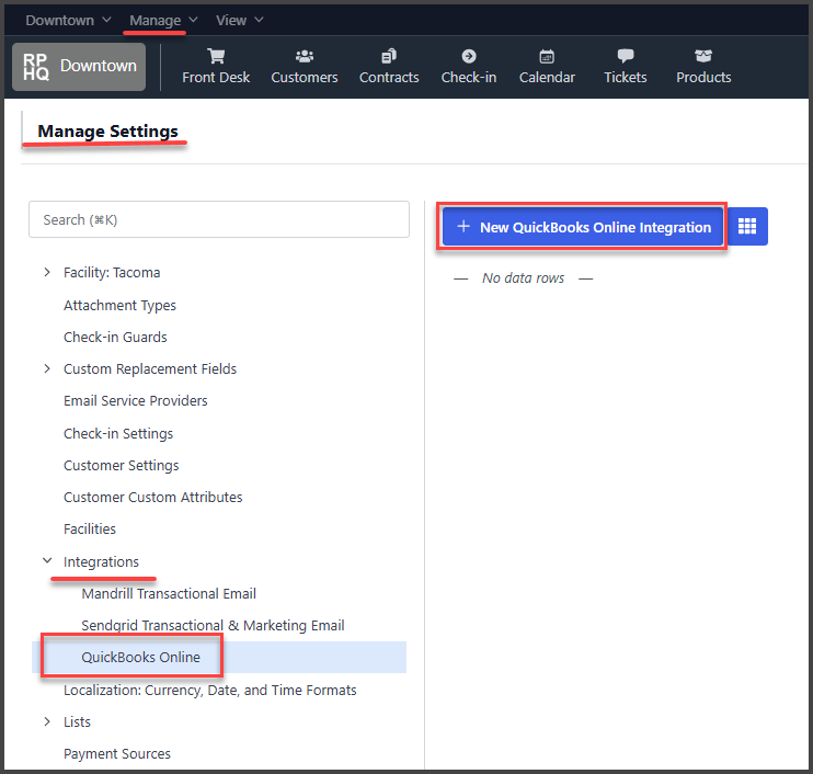 In Manage Menu > Organization & Facility Settings > Integrations (Dropdown) > QuickBooks Online