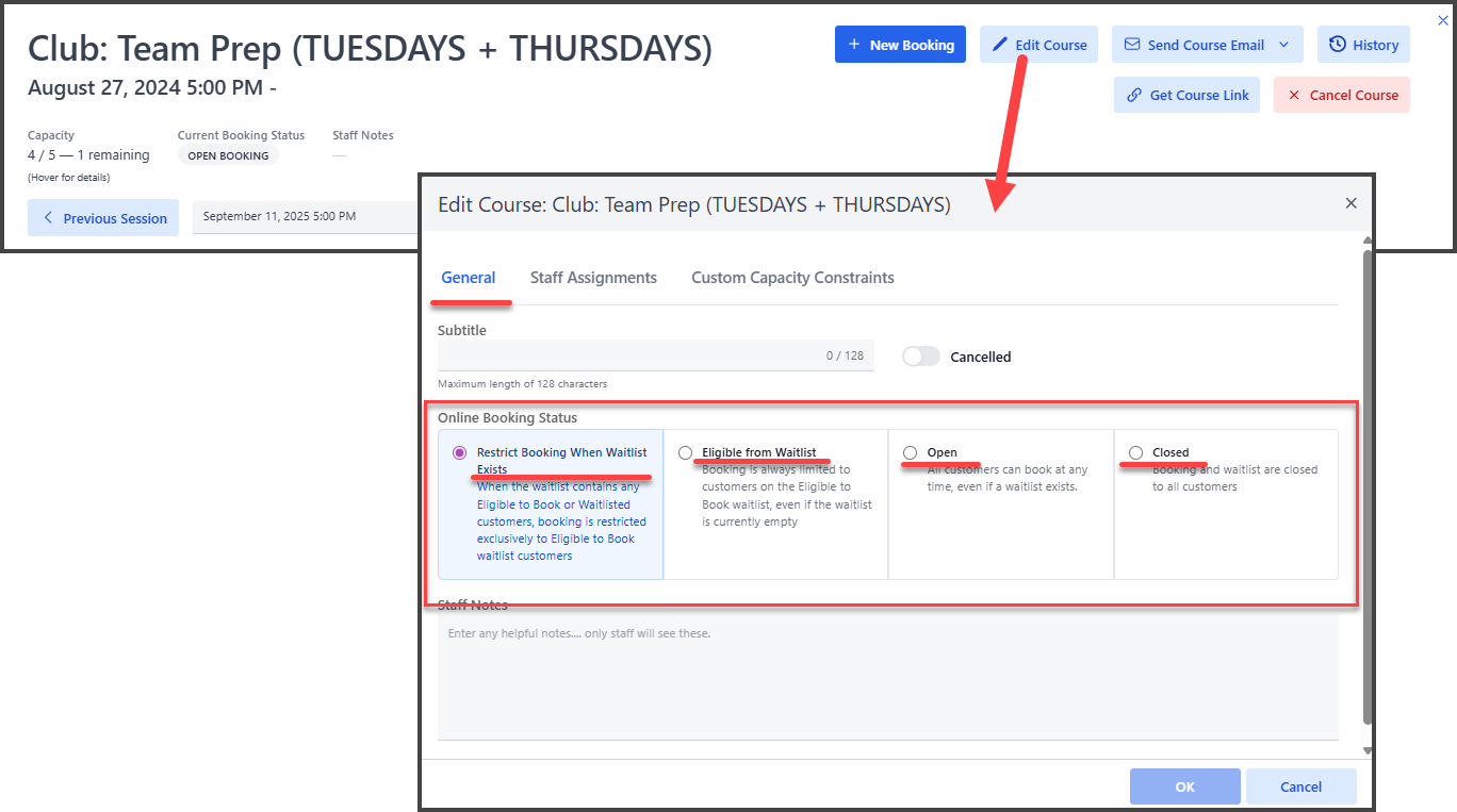 Calendar: Added new Waitlist Settings when editing a course, giving you four customizable options to control how bookings and waitlists are managed.