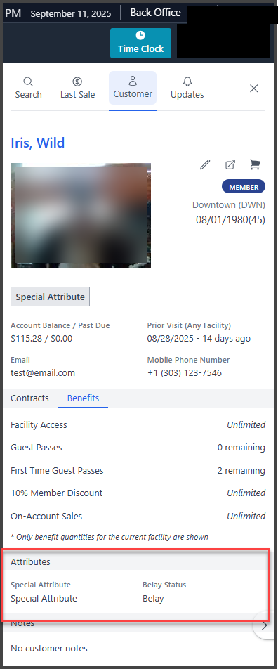 When viewed in the customer sidebar, either in the check-in screen or POS, the Customer Attribute defined in the Customer Ribbon will display, for added visibility: