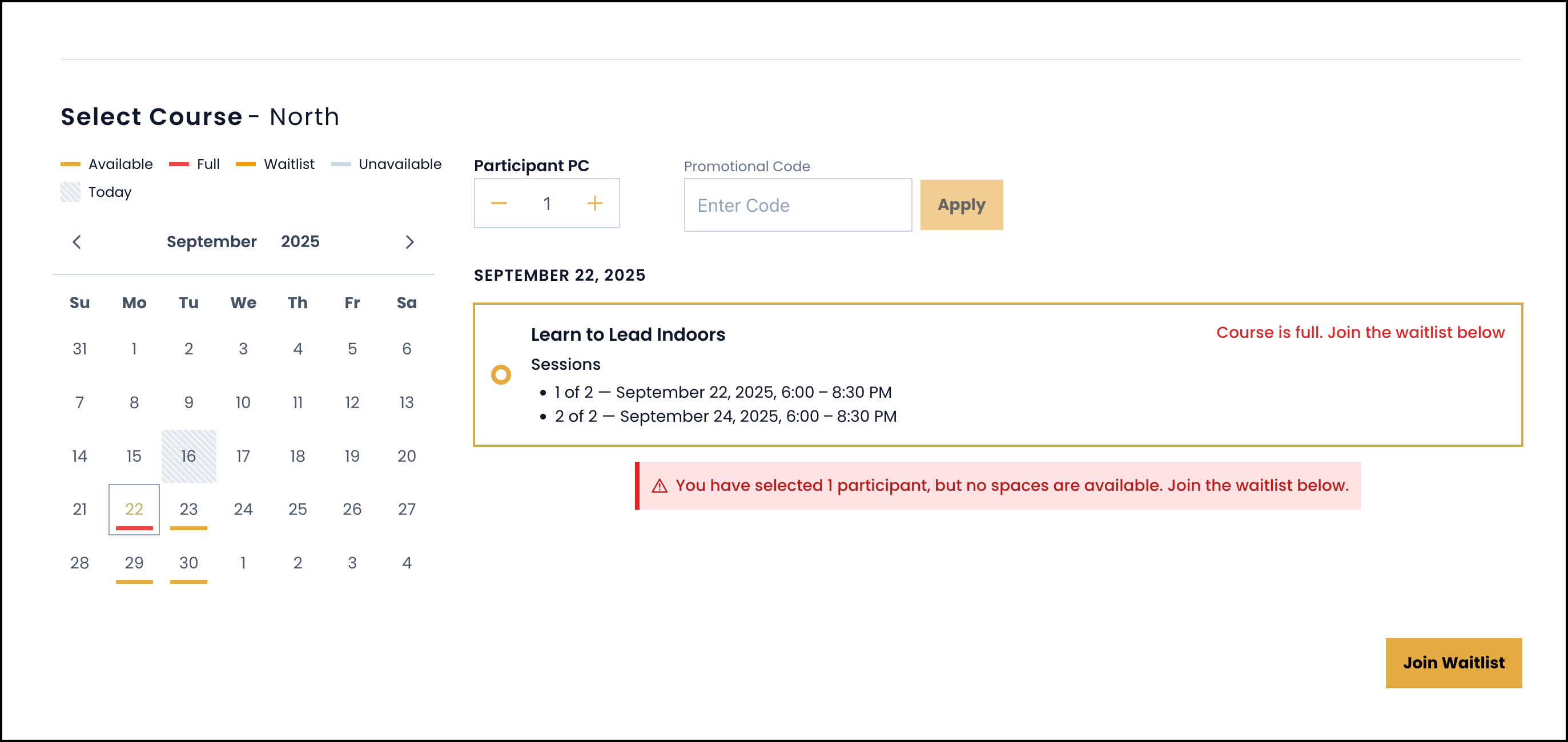 Use case: Keeps booking flexible and open, ideal for courses where you want to maximize attendance and don’t need to enforce waitlist priority.