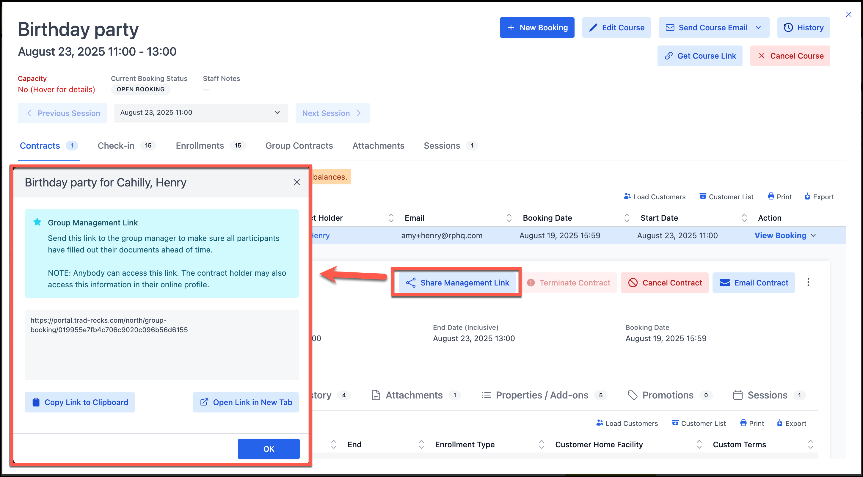 Previously to view the link and see participants that have filled out documents, you had to be signed in as the contract holder of the booking. The link emailed to customers is now a unique link that anybody with the link can view. You may also access this link through a new button when looking at the booking.