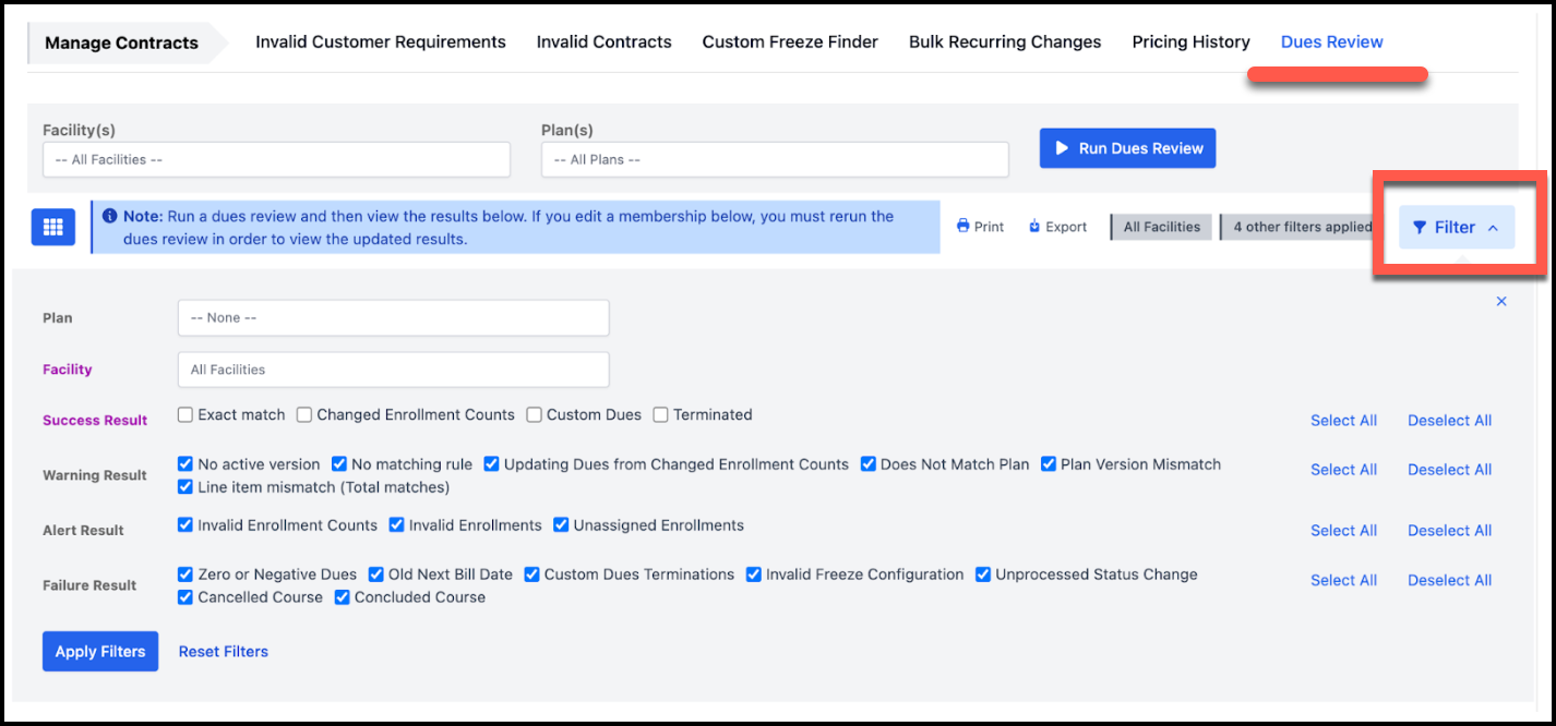 - You may be able to Correct in bulk, per facility, in Manage > Contracts > Recurring Billing Tasks > Plan Dues Changes. Filter to view all enrollment combos, with or without custom dues, and apply filter to view. Select all/some and add to change queue - confirm that the $0 dues change is the total difference and execute.