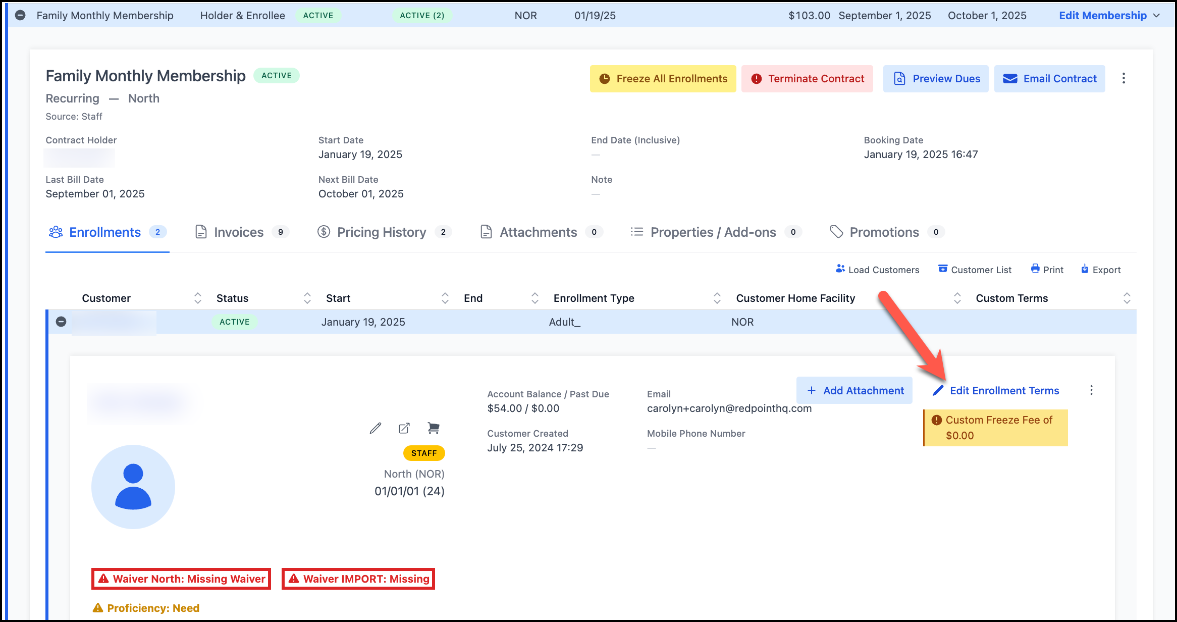 If you want to remove custom freeze fees, go to the contract and Edit Enrollment terms on each enrollee.