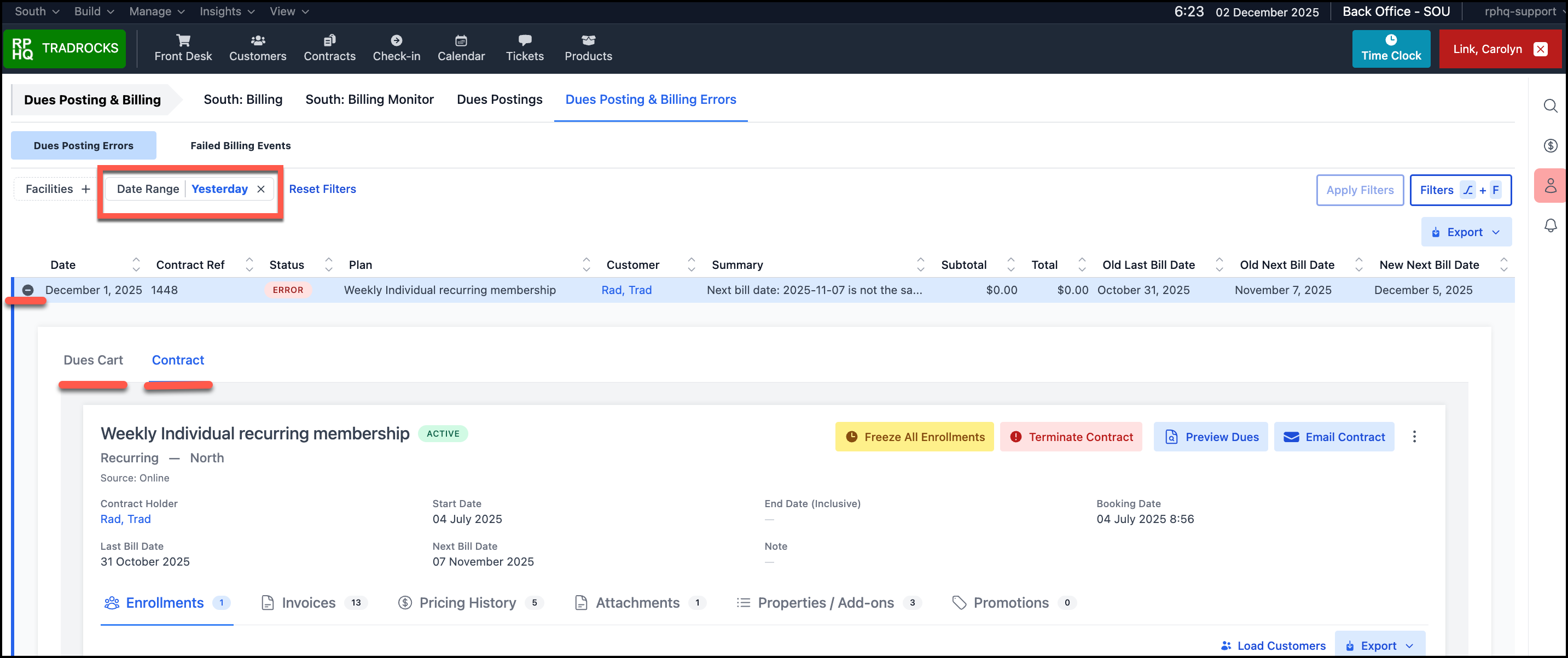 Expand the row to see the Dues Cart tab with the error and the Contract tab.