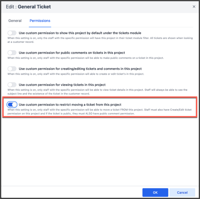 Tickets: Added an explicit custom permission required for changing ticket projects.