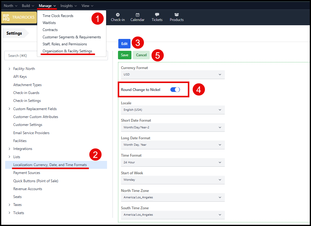 - Manage > Organization & Facility Settings
