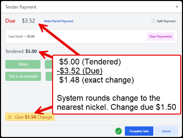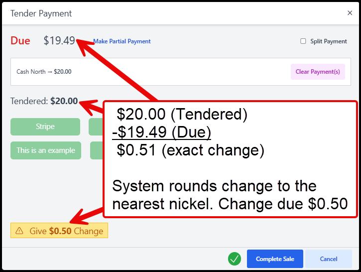 If the total for the transaction is $19.49, and the staff member has entered a tendered amount of $20.00. If the business calculated change to the exact cent, the customer would receive $0.51. However, because this organization uses nickel rounding, the system prompts the staff member to return $0.50 instead.