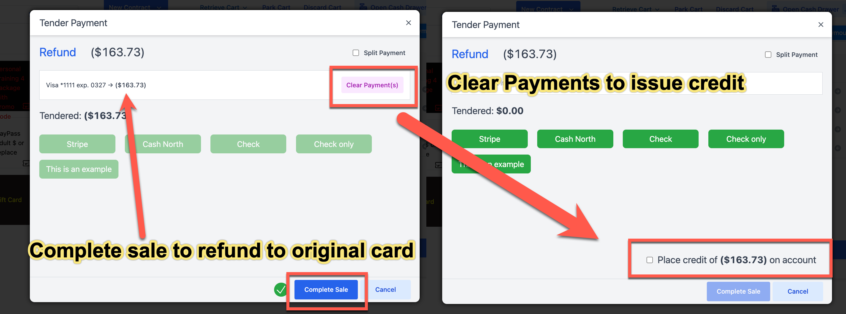 - Issue Refund, then either refund to the card originally used OR issue a credit