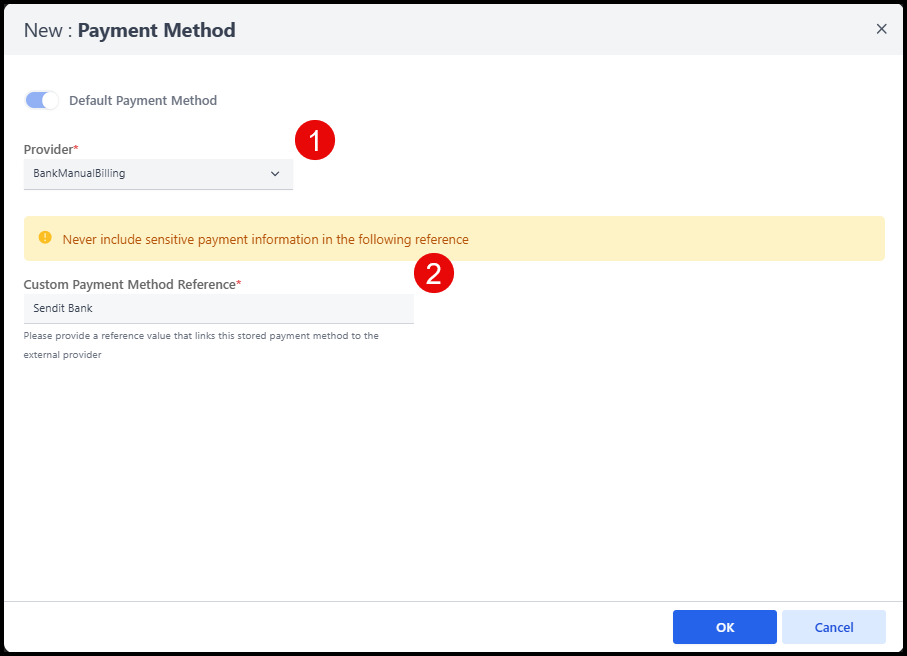 - Provide a Custom Payment Method Reference (any unique identified you want to add. Note that this is not an encrypted field - we do not recommend storing account numbers here!)