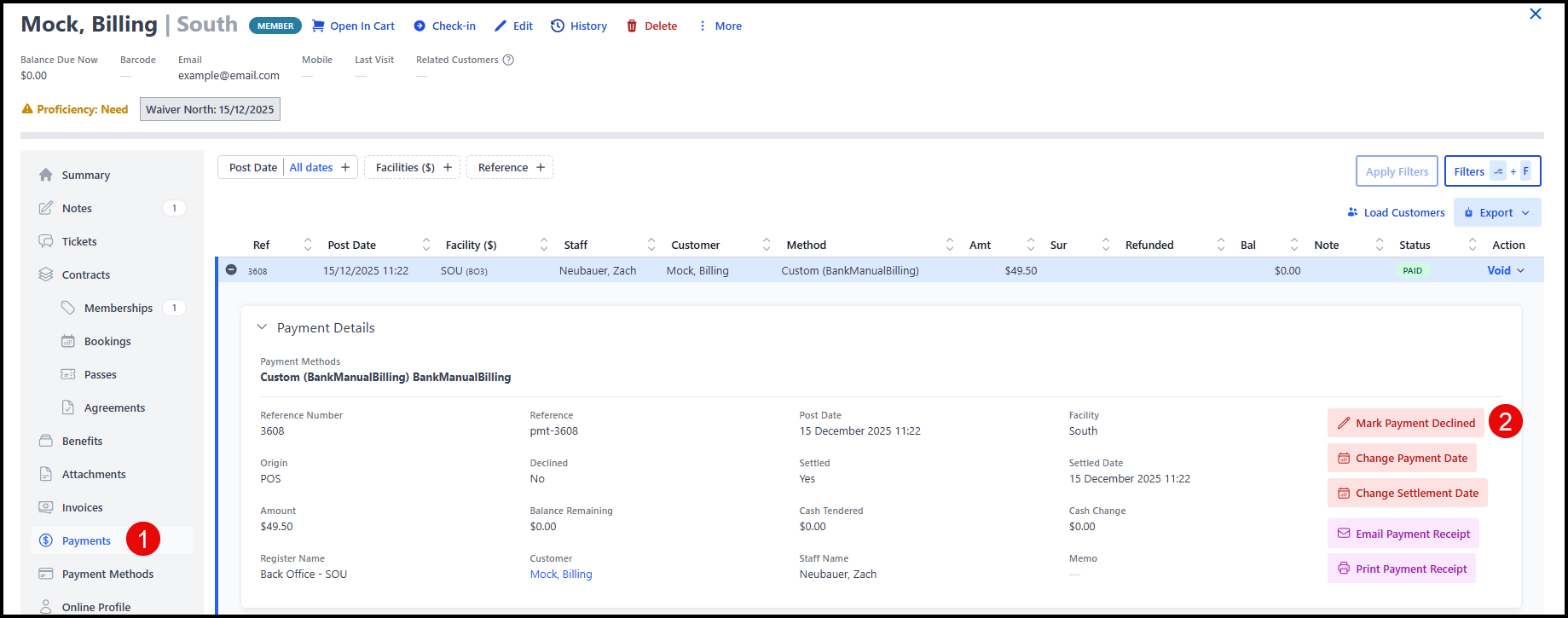 - Expand the related payment and press "Mark Payment Declined"