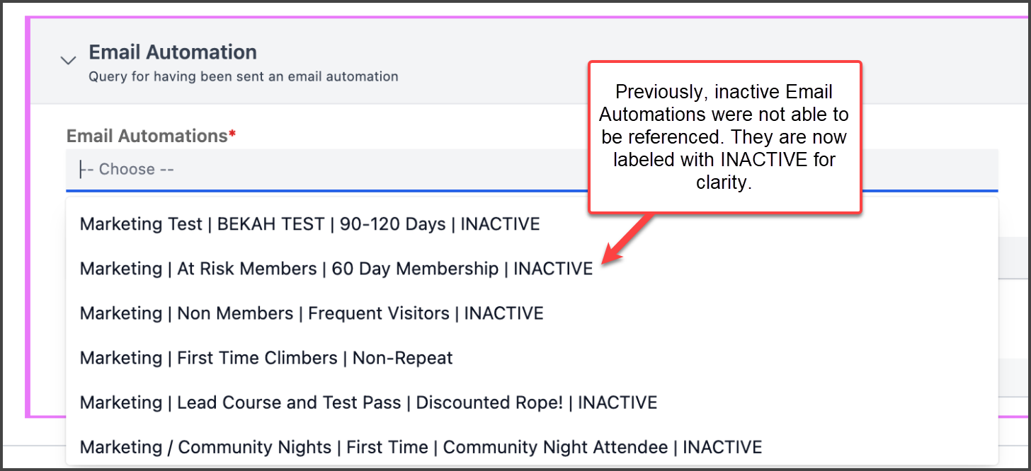 Segments: Select inactive Email Automations in Segment Conditions.