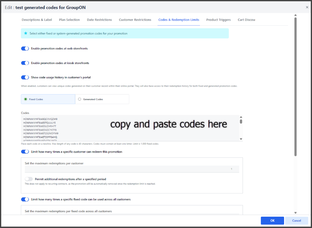 Fixed promotion codes, for Contracts, now support clearer configuration for both per-customer and per-code redemption limits, with the ability to add up to 1,000 fixed codes to a promotion. Labels and settings in the settings have been updated to better reflect these options.
