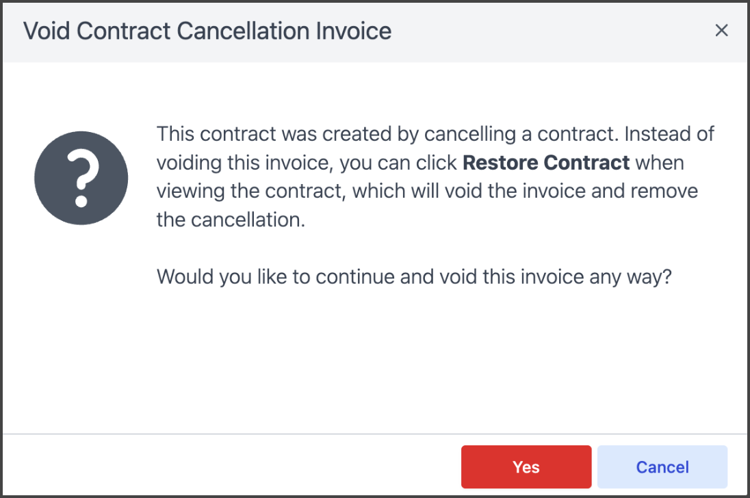 Previously, if an invoice was created from contract cancellation, it was not possible to void the invoice. This is now possible, with a confirmation informing of the standard practice to use Restore Contract to undo the cancellation and invoice as one operation.