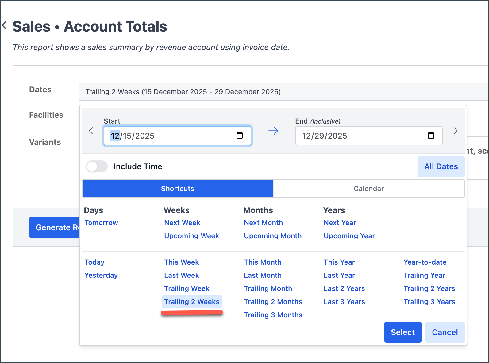 User Interface: Trailing Two Weeks added as option in all date range filters