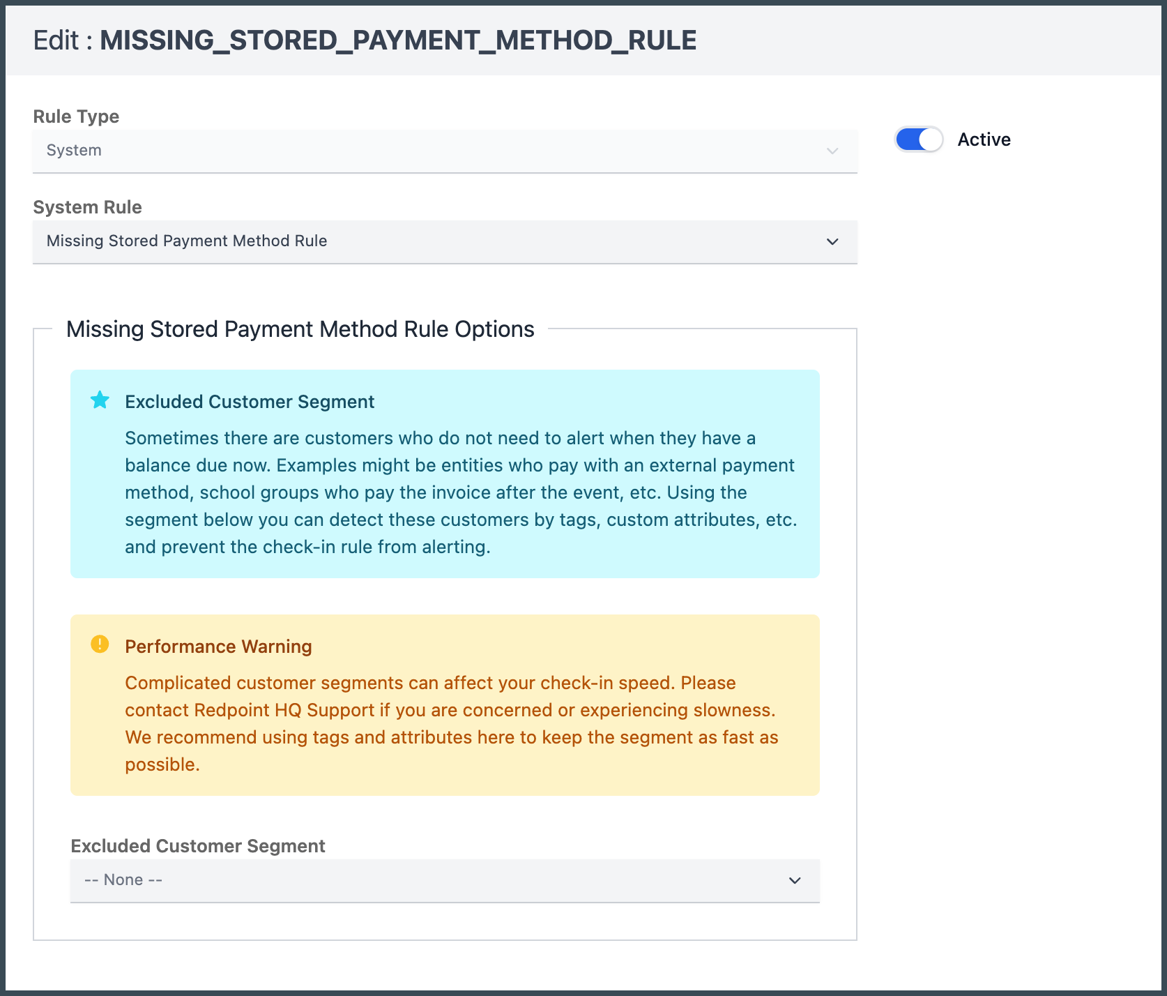 To remove unnecessary alerts at check-in, a customer segment can be excluded from missing payment method alerts. Possible examples for usage include entities who pay with an external payment method or school groups that pay an invoice after the event (kids on the school group booking would previously alert because the contract holder has an account balance and no stored payment method).