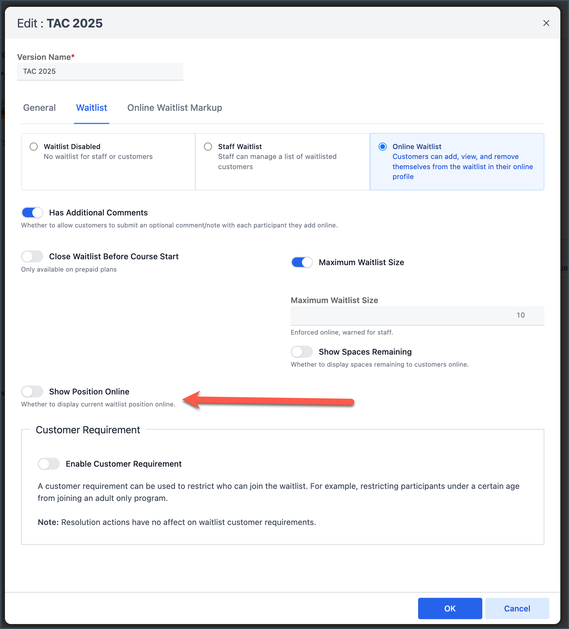 Added a toggle In Online Waitlist Settings to hide waitlist position when viewing Bookings from the Customer Portal.