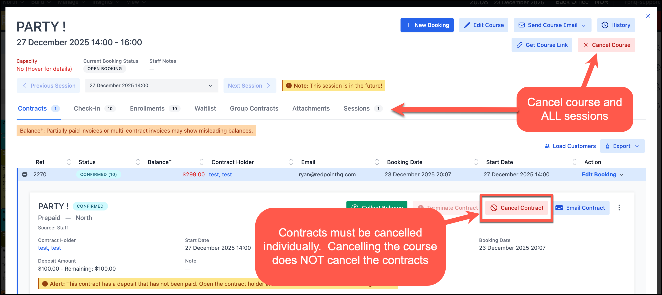 Cancelling a course or session does NOT cancel any confirmed or active contracts contained in the course.