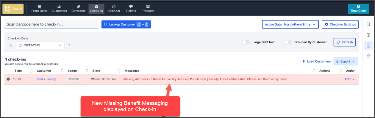 In Manage (Menu) > Organization and Facility Settings > Check-In Guards > Edit Check-In Guard > Edit Benefit_Rule Check-In Rule > Customize Missing Benefit Message (Text Box)