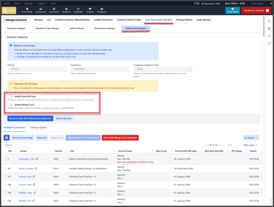 Added a bulk billing update tool that lets you update the next billing date and billing cycle (weekly/monthly) across active contracts. This tool can also be used to identify contracts that do not align with their plan configuration.