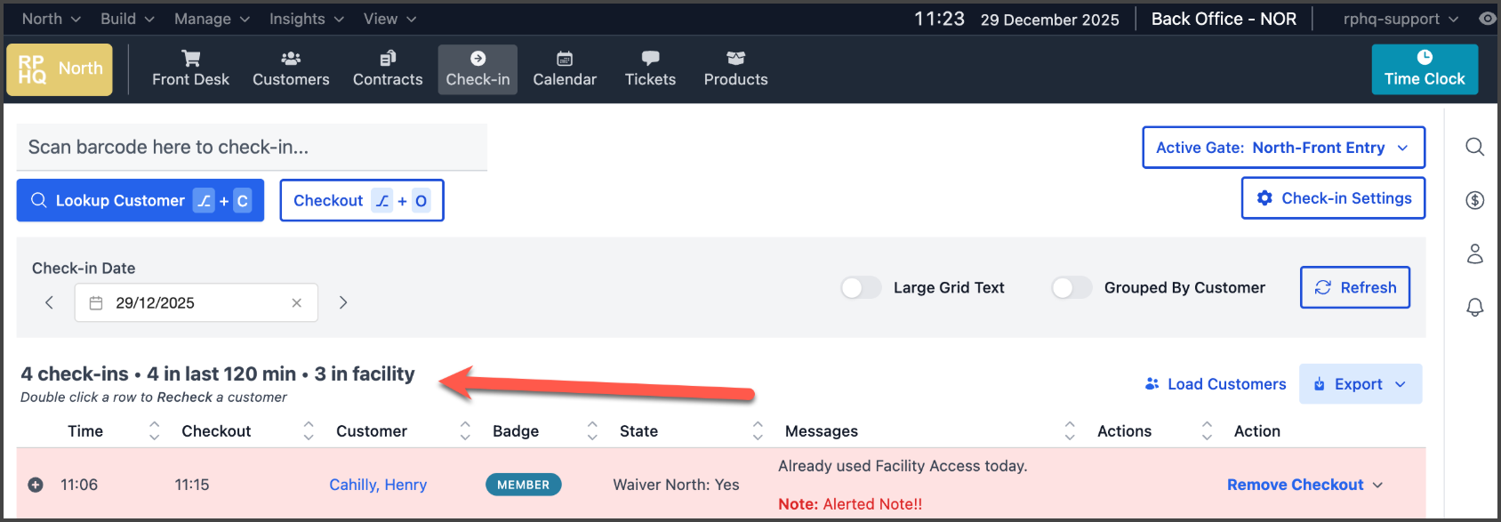 Check-in: Display 'In Facility' Count from check-in Screen.