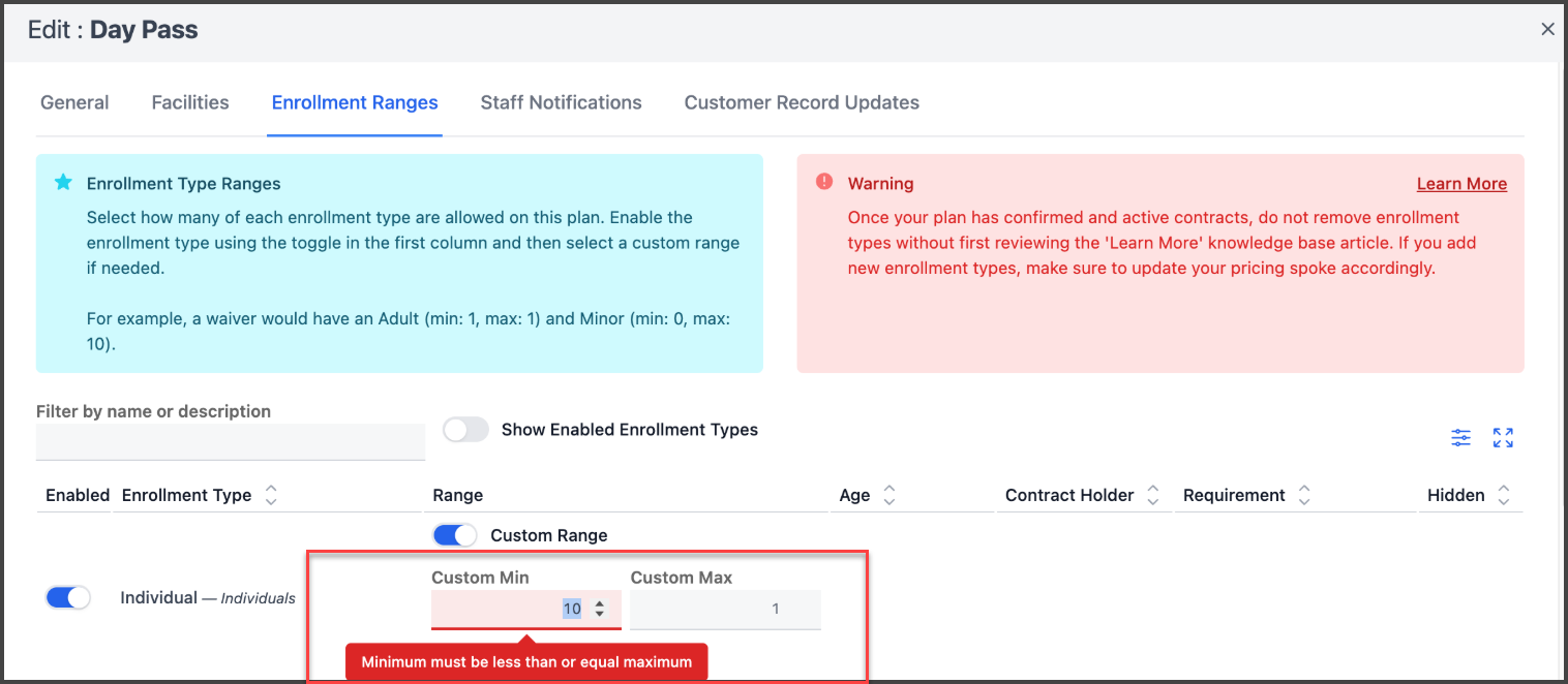 Plans: Added a warning when an enrollment range minimum is set higher than the maximum value.