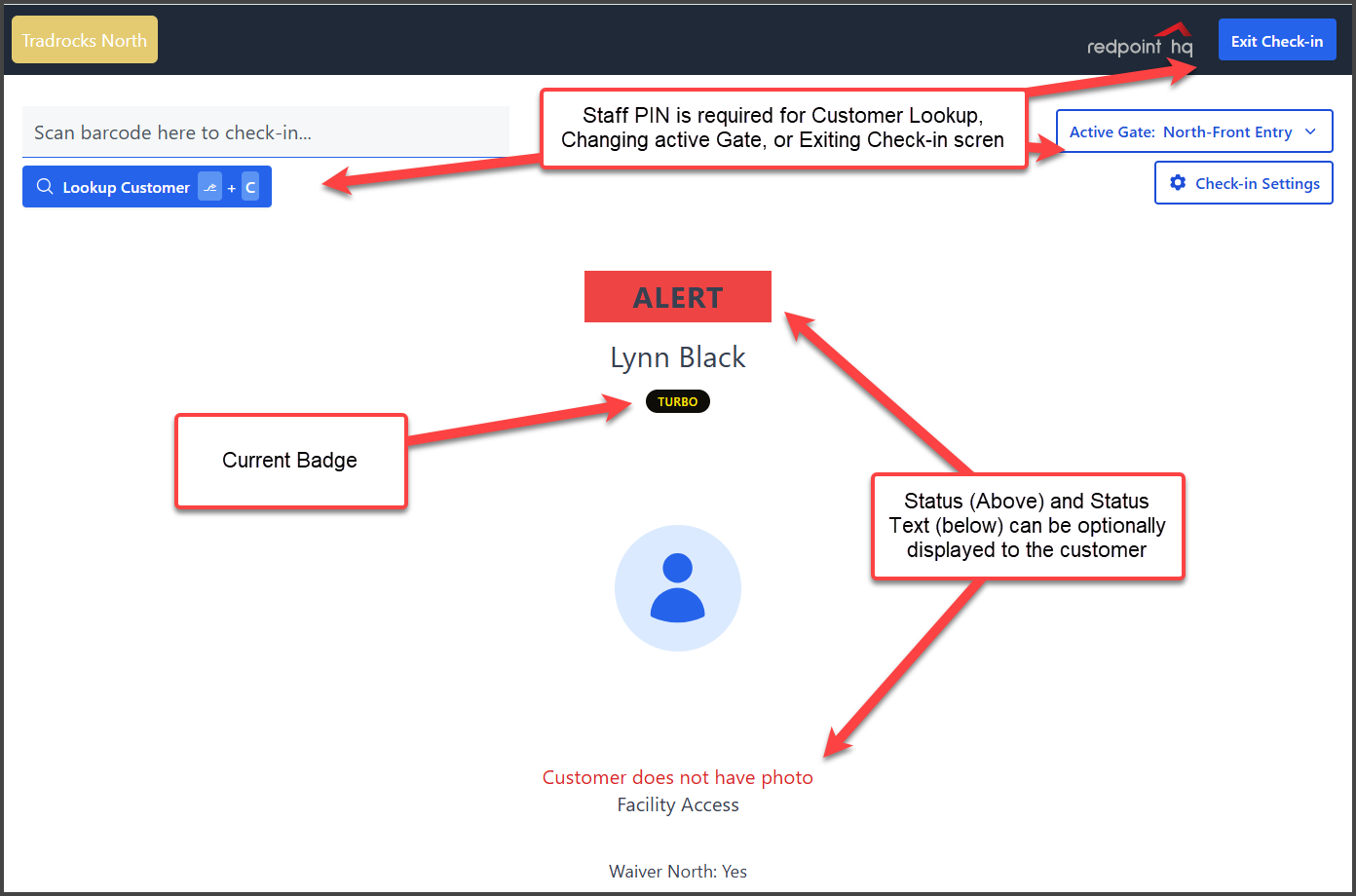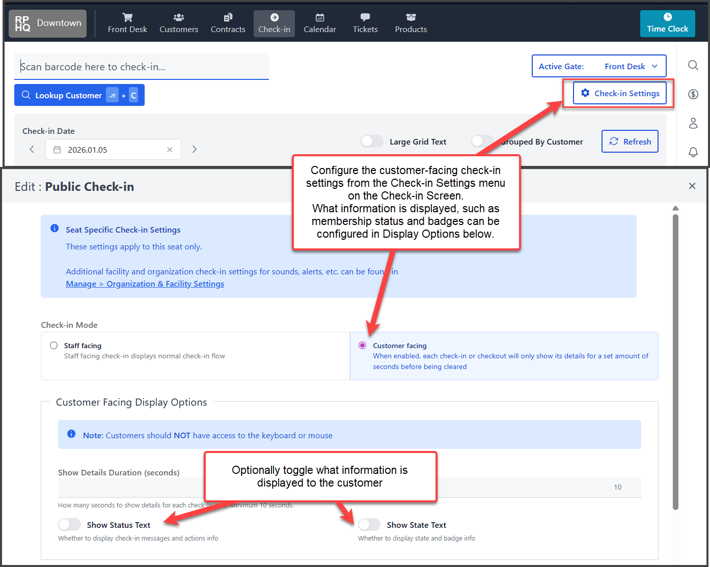 The Customer Facing Check-In Screen can be customized to display the following information: Exit Check-In only allows staff to view other modules. Check in will stay in Customer facing mode until a Staff PIN removes the Customer facing option.