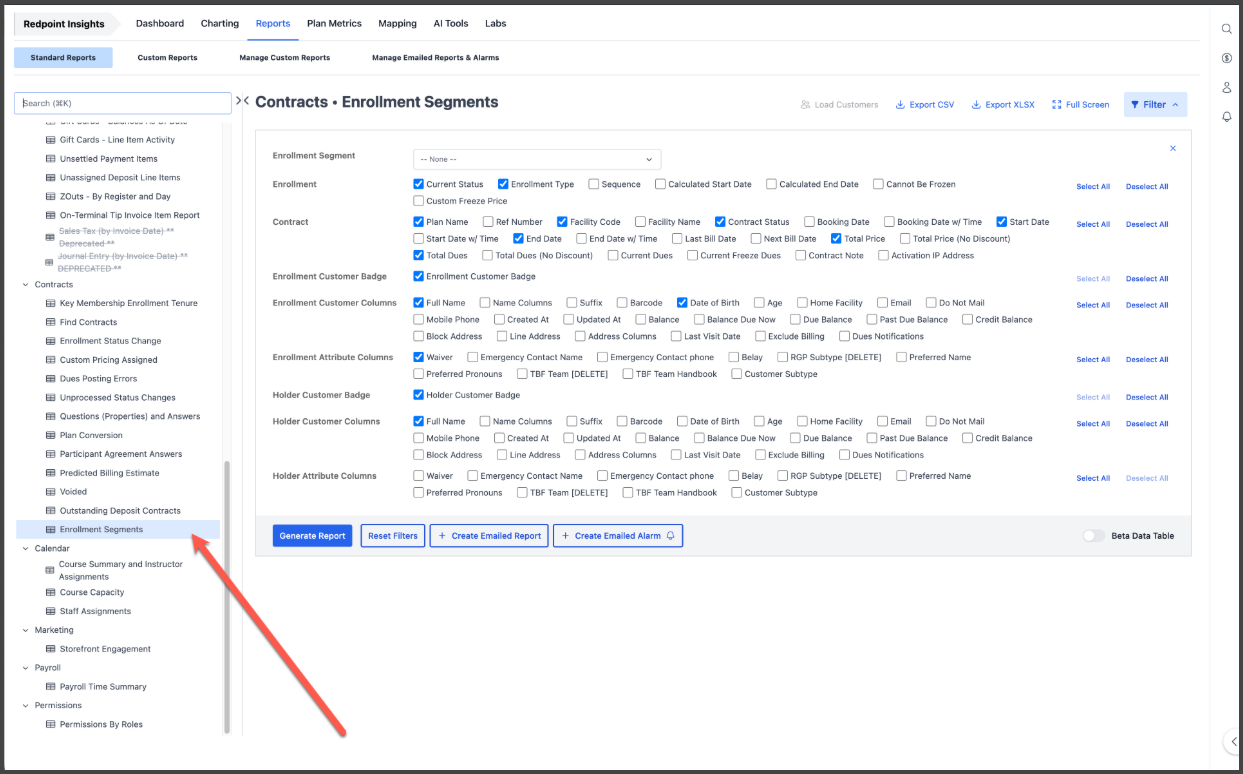 In Insights (Menu) > Reports (Tab) > Standard Reports (Tab) > Contracts (Dropdown) > Enrollment Segments