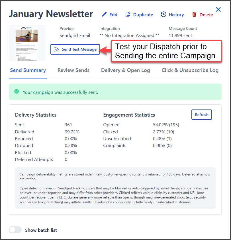 Once sent, the dispatch will move into a sent or scheduled state and analytics will begin populating after delivery.