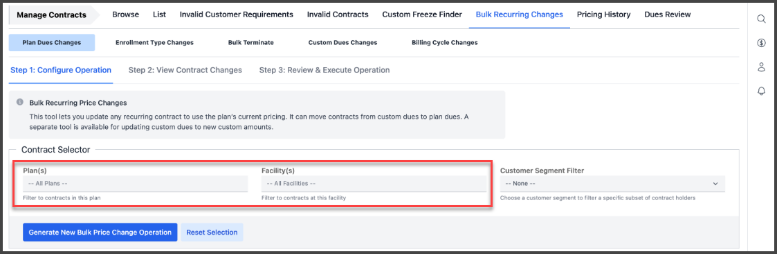 In Manage (Menu) > Contracts > Bulk Recurring Changes (Tab) > Plan Dues Changes (Tab) > Step 1: Configure Operation