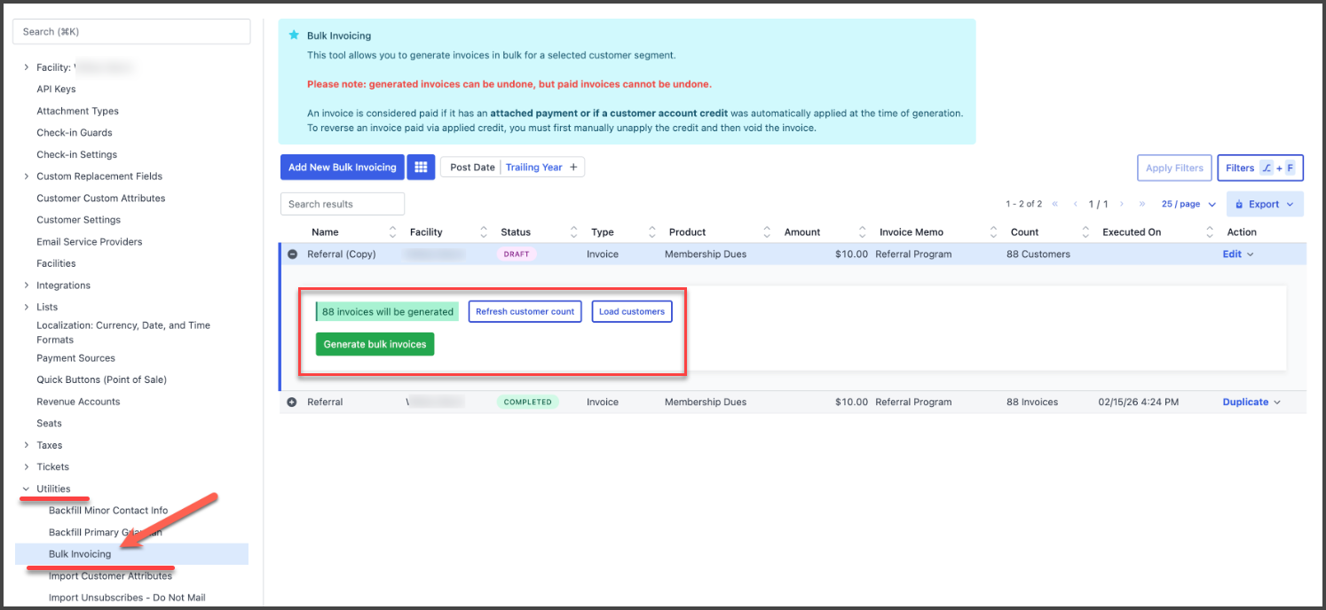 In Manage (Menu) > Organization and Facility Settings > Utilities (Dropdown) > Bulk Invoicing