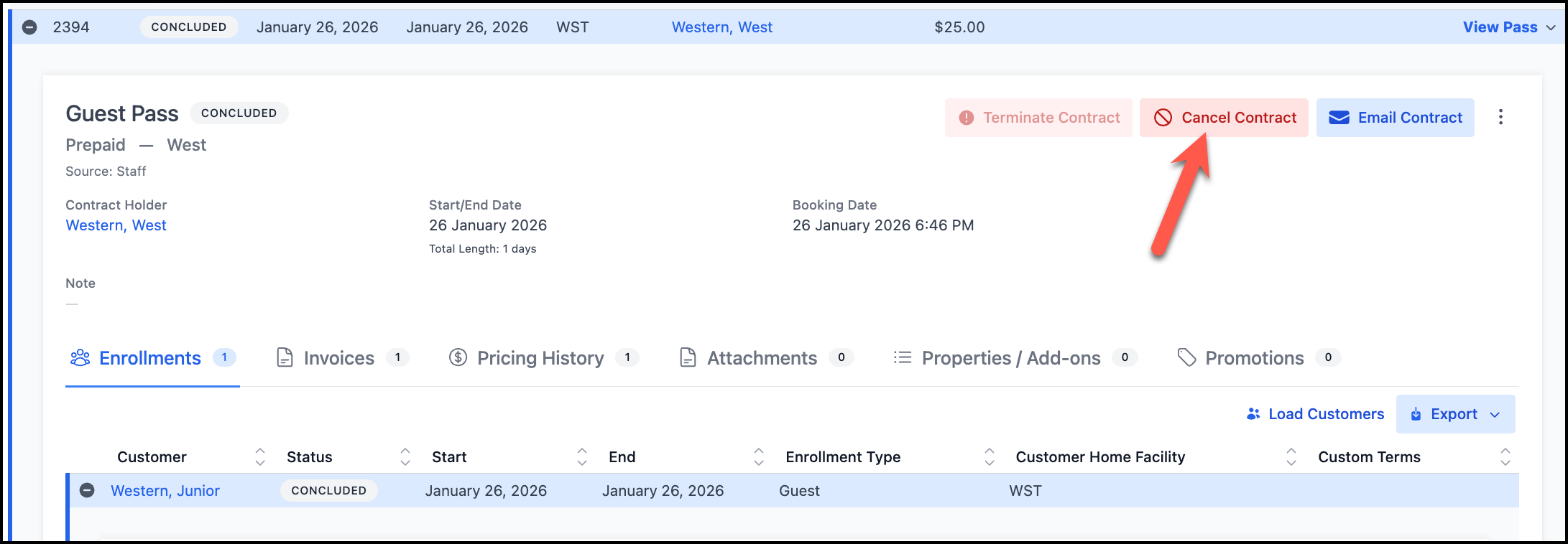- Edit the Pass, and on the Customers tab, Remove the enrollments to terminate them on the contract