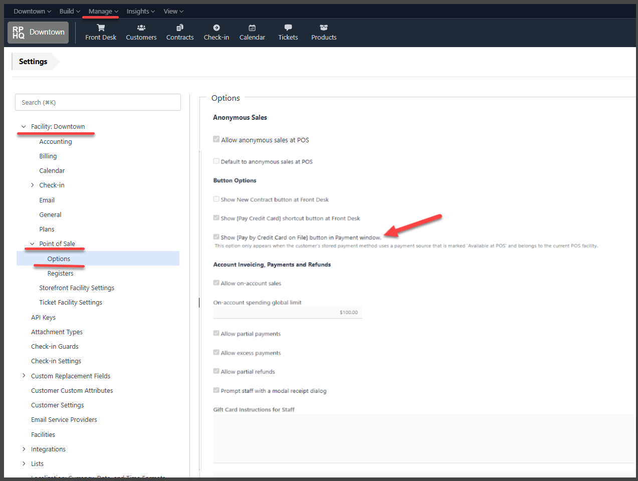 In Manage (Menu) > Organization & Facility Settings > Facility (Dropdown) > Point of Sale > Options