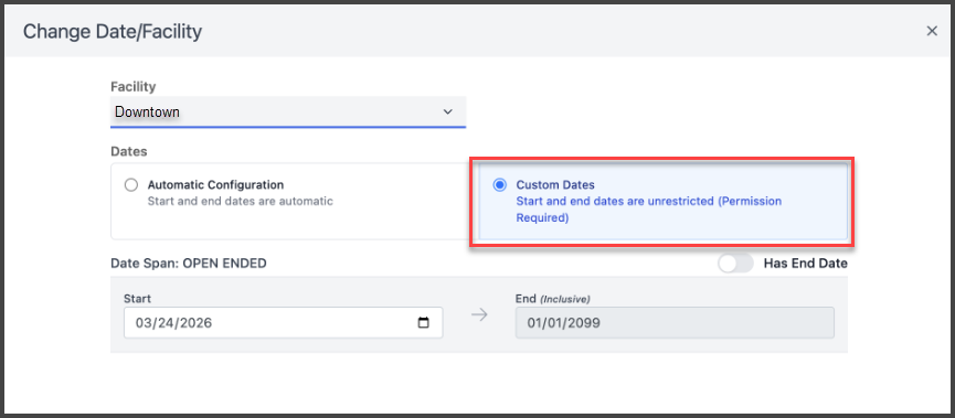 Once the contract is a saved draft you can edit the dates to custom (permission required)