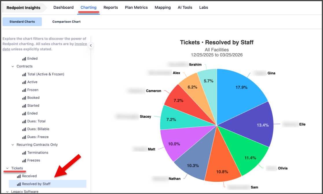 In Insights (Menu) > Charting (Tab) > Tickets (Dropdown) > Resolved by Staff