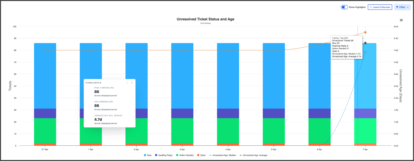 Track unresolved tickets by status and see how long they stay open. Use day, month, or year views to spot backlog spikes and aging trends across facilities