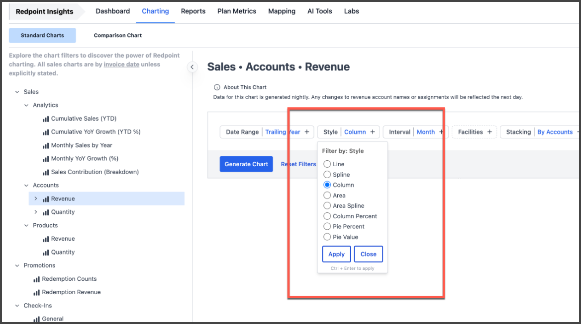 Charts: Reformatted Interval, Style, and Stacking filters with radio buttons