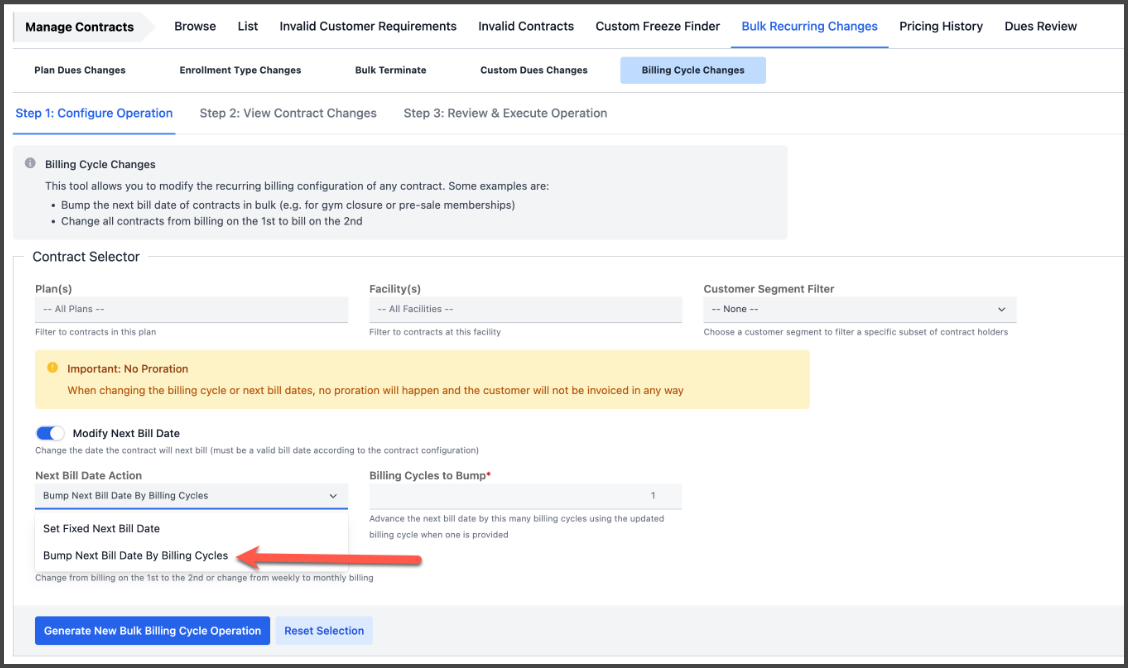 In Manage (Menu) > Contracts > Bulk Recurring Changes (Tab) > Billing Cycle Changes (Tab) > Next Bill Date Action