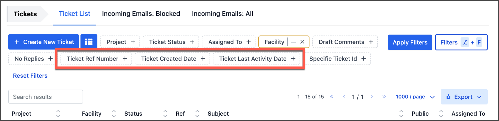 Tickets: Added three new ticket filters for Reference number, Last Activity Date, and Created Date