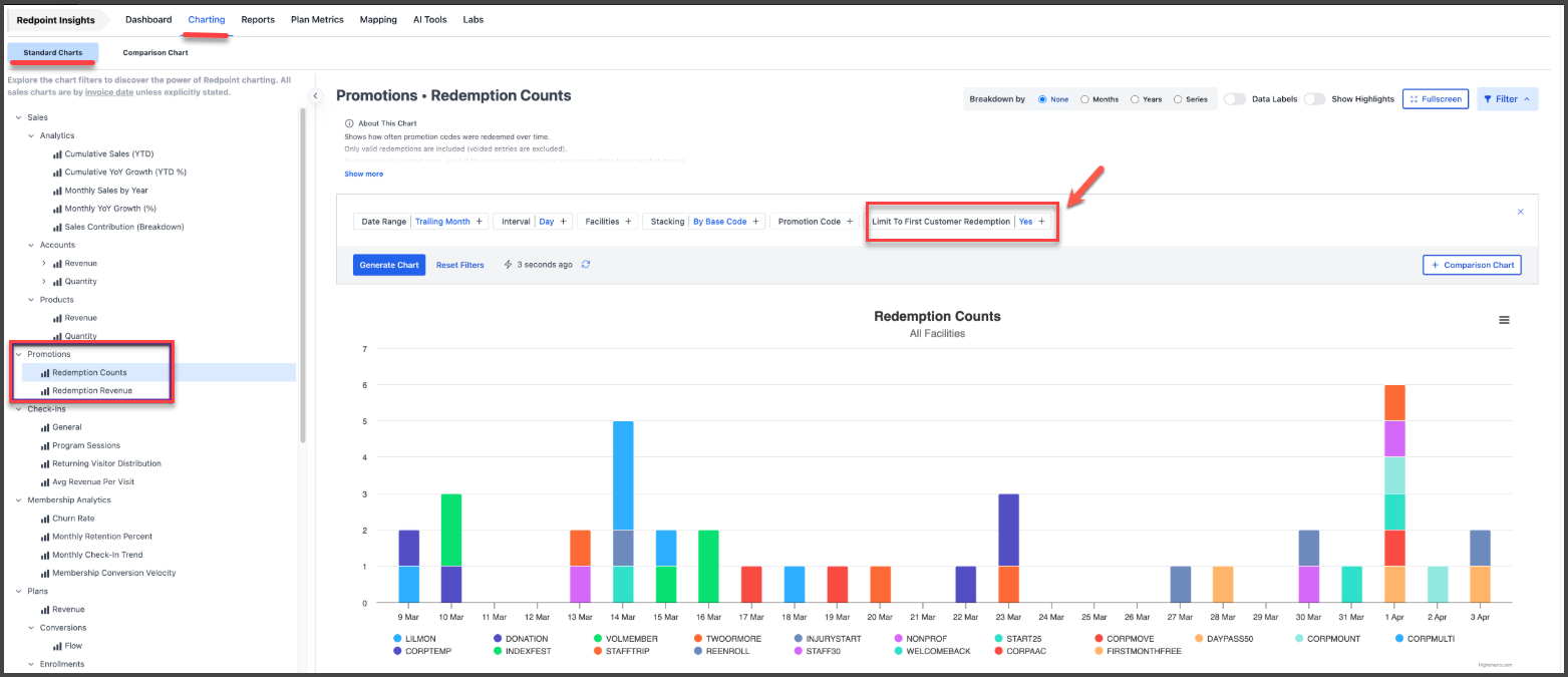 Charts: New promotion redemption charts for Redemption Counts and Revenue